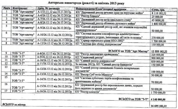 Итак, общая сумма выплат госпредприятию "Информационный центр" от Минюста за 2010–2013 гг. за то, что украинцы пользовались принадлежащими государству реестрами, составила 1 миллиард 115 миллионов 120 тысяч гривен!