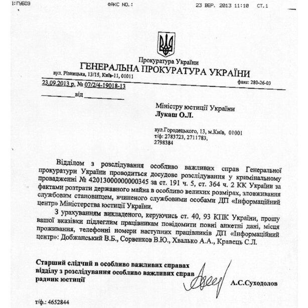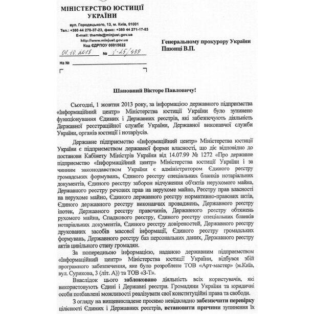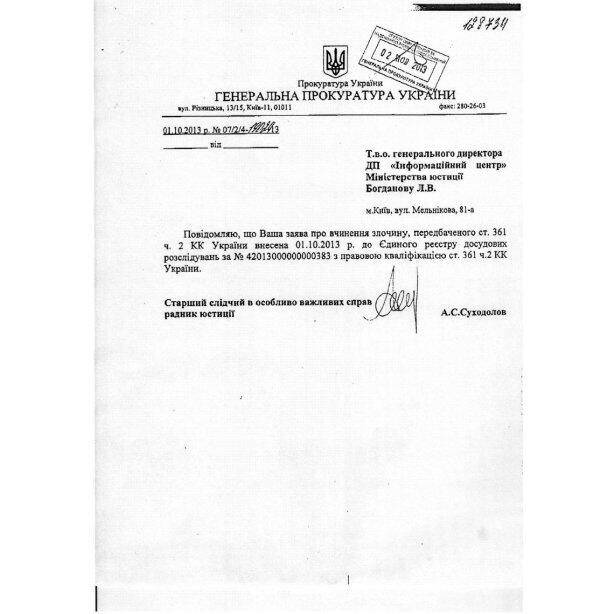 А теперь относительно событий 1 октября 2013 г., когда Министерство юстиции Украины на своем интернет-сайте сообщило о блокировании реестров, обеспечивающих деятельность Государственной регистрационной службы Украины, Государственной исполнительной службы Украины, органов юстиции и нотариусов. Итак, Генеральная прокуратура Украины сообщила о выявлении факта вмешательства в информационные сети Министерства юстиции и открытии по этому поводу уголовного дела.