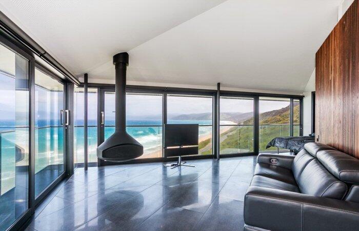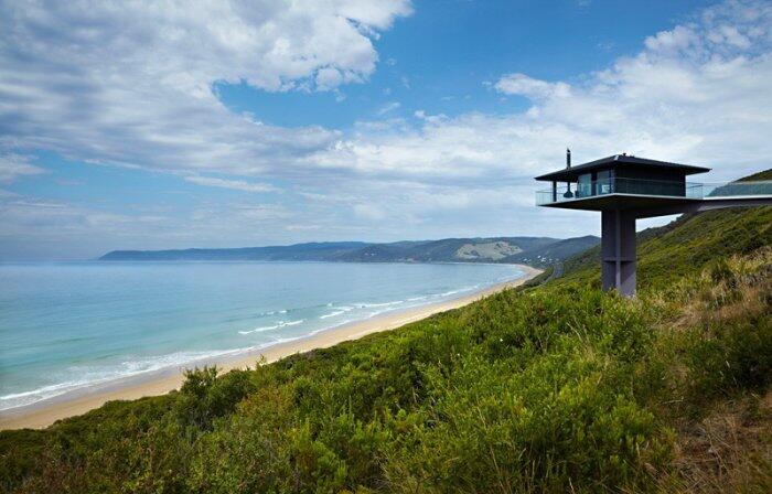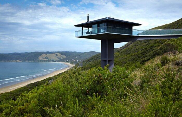 Проект возвышается не просто над землей. Под ним проходит легендарная австралийская автострада Great Ocean Road. С учетом того, что дом возвышается на такой высоте и расположен на круглом бетонном основании, попасть в него можно только по специальному мостику, соединяющему пространство дома с близлежащей возвышенностью-холмом. Из гостиной дома на пилоне открывается потрясающая панорама на океан. Только ради этого уже стоило реализовать проект. ![]()