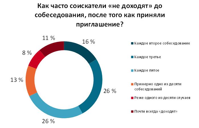 9 из 10 работодателей сталкиваются с ситуацией, когда соискатель «не доходит» до собеседования. У 16% рекрутеров срывается каждое второе собеседование, у 26% — каждое третье, еще у 26% — каждое пятое. 13% по вине соискателей отменяют примерно одно из десяти запланированных интервью, 8% — еще меньше. И только каждый десятый эйчар почти все собеседования проводит в плановом режиме.