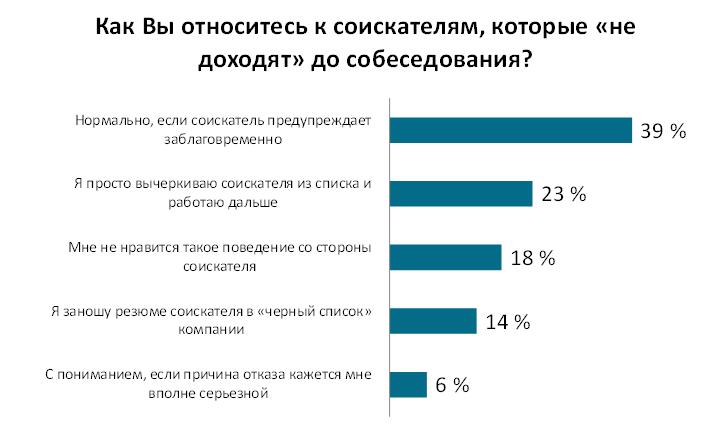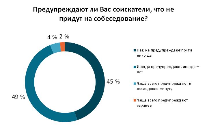 Даже в условиях, когда работу найти трудно, чуть меньше половины соискателей не считают нужным оповестить рекрутера о том, что не придут на собеседование. 49% эйчаров заявили, что иногда соискатели предупреждают об изменении планов, а иногда —нет. 4% предупреждают HR-менеджеров в последнюю минуту. И только двое из ста потенциальных работников соблюдают деловой этикет и оповещают рекрутера заранее.