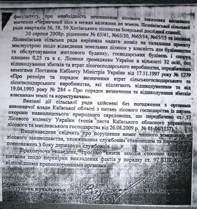 Аби не допустити вирубки зелених насаджень й приватизації лісового заказника «Чернечий ліс», Головне управління Держкомзему у Київській області звернулось до Державного комітету земельних ресурсів та Мінприроди України з вимогою провести перевірку щодо законності виділення землі. Оскільки «передача земель відбулась із порушенням земельного і лісового законодавства, зловживанням службовим становищем та перевищенням повноважень з боку державних службовців», – йдеться у листі заступника начальника ГУ Держкомзему у Київській області Юрія Вязьмітінова.