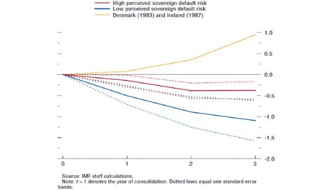 Щоб виправити ситуацію, ці країни провели різку податково-бюджетну консолідацію на рівні 3% ВВП. Графік показує "експансивні" наслідки таких заходів. Він також демонструє, що країни з великим ризиком суверенного дефолту в підсумку пережили менше падіння ВВП, ніж країни, чий ризик дефолту вважали низьким.