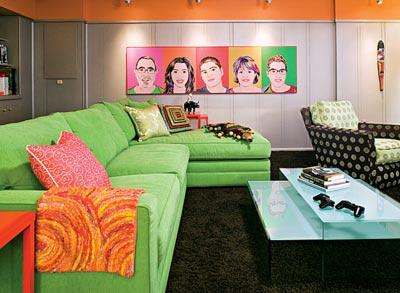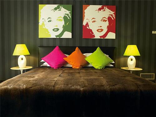 Поп-арт - это обилие деталей и разнообразных мелочей. Мотивы могут повторяться: как для фона (ковры с растиражированным рисунком, настенная плитка), так и для акцента (картины, постеры). Желательно использовать яркий, пестрый текстиль, подобранный в соответствии с цветовой гаммой. В качестве украшений подойдут стилизованные пластиковые аксессуары: вазы, светильники, подсвечники, статуэтки, часы и рамки для фотографий.
