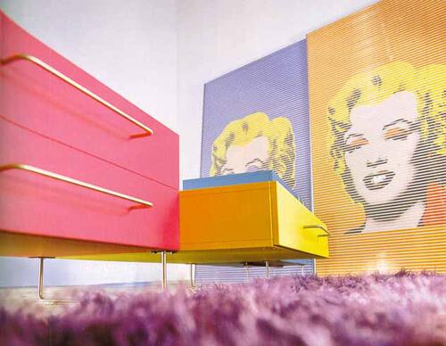 В числе других особенностей можно назвать мебель из пластика, глянцевые поверхности (дань гламуру), округлые необычные формы в стиле «ретро-футуризма». При дизайне Поп-арт интерьера учтите, что он не приемлет шкафов. Их отсутствие компенсируют полками, нишами и воздушными стеллажами. Важный аспект: на мебель предпочтительно наносить граффити, рисунки из комиксов или оригинальные орнаменты.