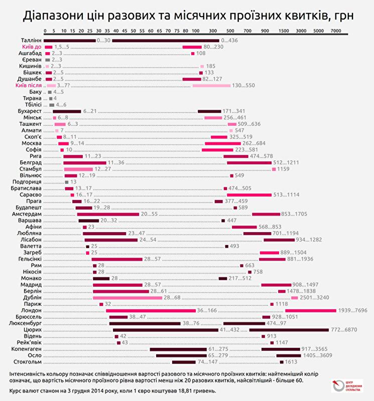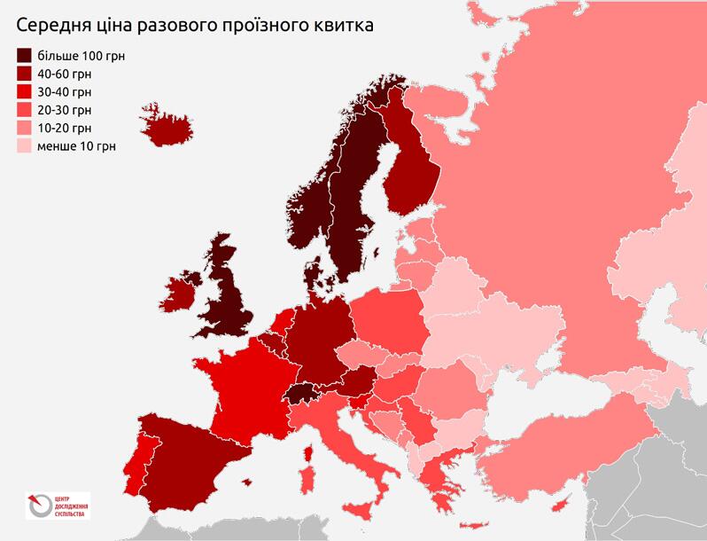 Я кщо порівнювати середні значення цін на разовий проїзд, найдешевшими вони є в Ашгабаді, Єревані та Кишиневі. Загалом же, найдешевшим є міський громадський транспорт в пострадянських, а також в деяких балканських країнах. Рухаючись на північний захід, ціни на проїзд зростають, досягаючи максимальних значень у Копенгагені, Лондоні, Осло, Стокгольмі та Цюриху. Разова поїздка може коштувати там більше 100 гривень. Середній тариф становить близько 35 гривень.