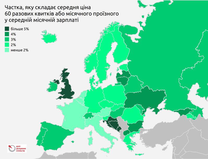 Порівнючи найменші з цих двох показників, бачимо, що найменше, до 2% зарплати, на транспорт витрачають у Франції, Італії, Австрії, Ісландії та країнах Бенілюксу. Від 2% до 3% платять в Скандинавських країнах, Німеччині, Польщі, Чехії і Словаччині, а також в Румунії, Словенії, Греції та Вірменії. Такий же відсоток має Київ зі старими тарифами. Низькі показники у більшості випадків забезпечуються за рахунок дешевих місячних проїзних.