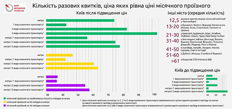 Наразі ціни на проїзд у Києві є одними з найнижчих як у Європі, так і серед пострадянських країн. Відносно низькою є також їхня частка у середній зарплаті. Після підвищення тарифів ситуація стане зовсім іншою. Ціна разового проїзду залишиться однією з найнижчих, однак деякі місячні проїзні досягнуть рівня центральноєвропейських столиць: наприклад, Братислави, Бухареста, Варшави та Софії, де вони коштують 300-500 гривень.