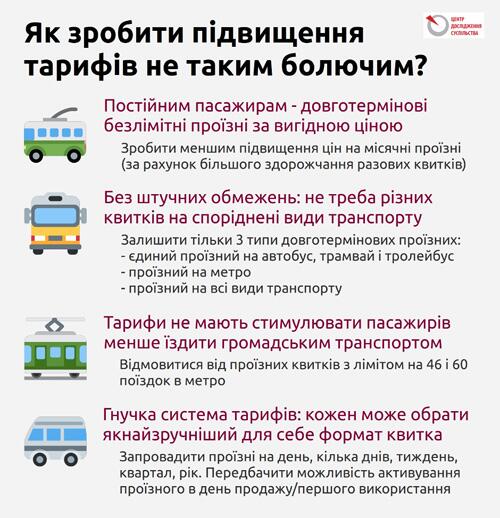 Потрібно робити абсолютно протилежне. Треба відмовитись від лімітів і знизити нову ціну місячних проїзних, що підвищить їхню привабливість для постійних користувачів громадського транспорту. Якщо зменшення цін на довготермінові квитки буде супроводжуватися підвищеням тарифів на разові поїздки, це дозволить зберегти сукупні доходи від їхнього продажу на тому самому рівні.