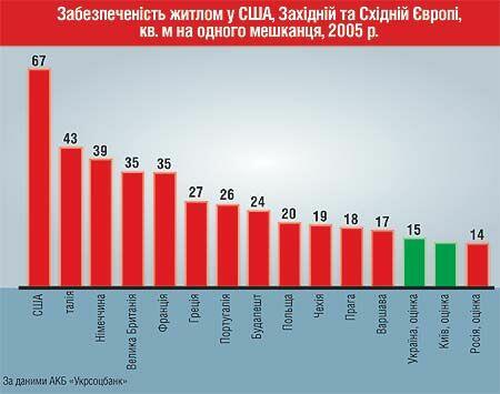 Жилой фонд столицы в прошлом году составлял 54 млн кв. м общей площади или 20,5 кв. м на одного жителя столицы. В Госкомстате утверждают, что такой метраж получается, если считать, что в Киеве живут 2,63 млн человек. Эрик Найман приводит другую цифру. По его оценкам, с учетом трудовых мигрантов, живущих в съемных квартирах, население Киева составляет 3,8-3,9 млн. Таким образом, в Укрсоцбанке подсчитали, что на одного жителя приходится не более 14 квадратов — почти вдвое меньше, чем в столицах Греции и Португалии, втрое меньше, чем в Риме и почти впятеро ниже вашингтонских норм.