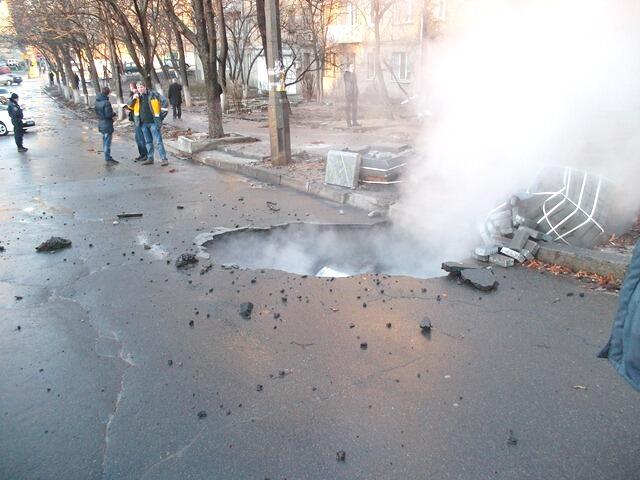"14 января в 14:45 на проезжей части по ул. Академика Филатова напротив дома 22/8 возникло чрезвычайное происшествие. Вследствие прорыва трубы (горячего водоснабжения) диаметром 800 мм произошел провал асфальтового покрытия диаметром около 2 метров, из которого ударил фонтан горячей воды. Его высота достигала более 10 метров. Практически весь поток горячей воды был направлен на жилой дом по ул. Академика Филатова, 22/8", - говорится в сообщении.
