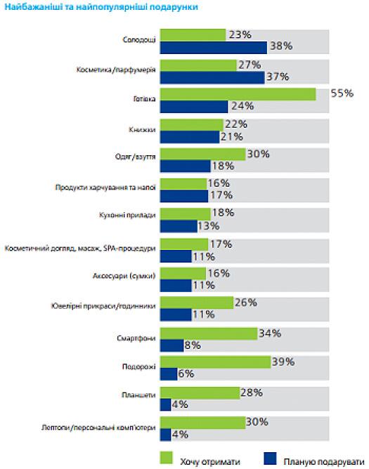 У 2014 році для українців, як і раніше, найбажанішим подарунком на новорічні свята є гроші. У 2013 році тренд практичності також був сильним: на гроші очікували 53% громадян, у 2012 році таких було 60%. Водночас серед подарунків, які українці планують дарувати, готівка лише на третьому місці.