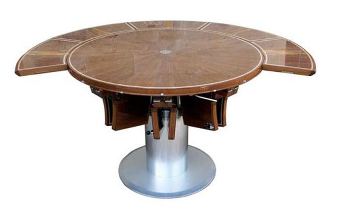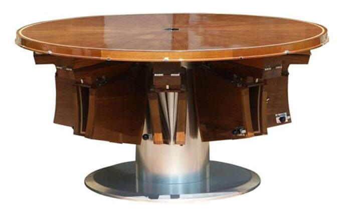 Можно разложить лишь часть стола Он может становиться выше или ниже. Простая гидросистема внутри стальной ножки позволяет поднимать и опускать столешницу. В отличие от своего огромного собрата дополнительные части раскладываются не самостоятельно, а их нужно добавить вручную, каждый модуль автономен.