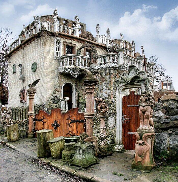 Также это дом скульптора Голованя, который построен в эклектическом стиле. Тут множество скульптур известных героев сказок и святых.