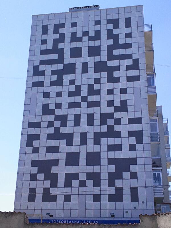 Многоэтажка со стеной-кроссвордом высотой в 30 и шириной в 18 метров. В «кроссворд» вписаны слова, которые видно лишь ночью.