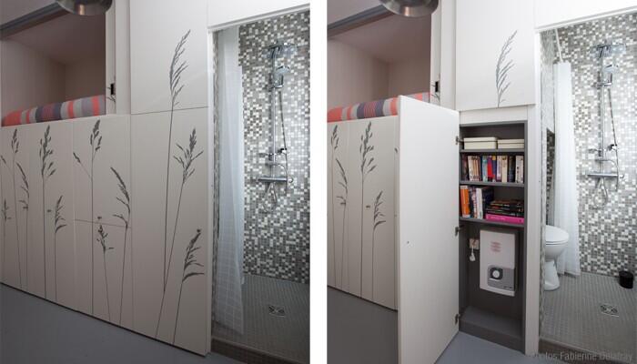 Здесь располагается и спальное место, и душевая, и кухня, и гардеробная, а также стол и шкаф для книг.