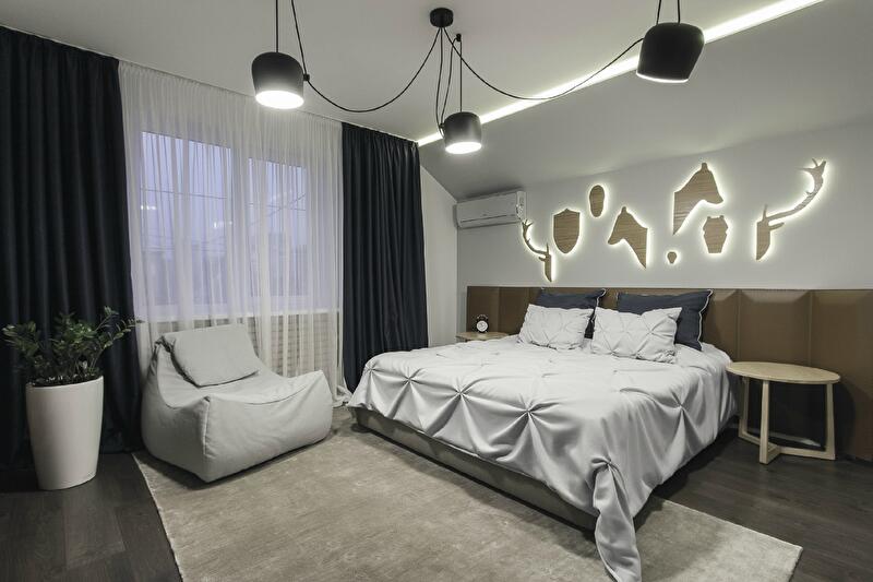 Висячие растения – тоже не метафора: три аккуратных минималистских белых горшка с цветами прикреплены за шнуры прямо к потолку и фактурно оттеняют собой деревянную стену в спальне. Рыбы – авторская вышивка SVOYA studio на декоративных подушках – тоже не просто так: в данном случае они символ комфорта хозяев, которые живут в своем доме как рыбы в воде.