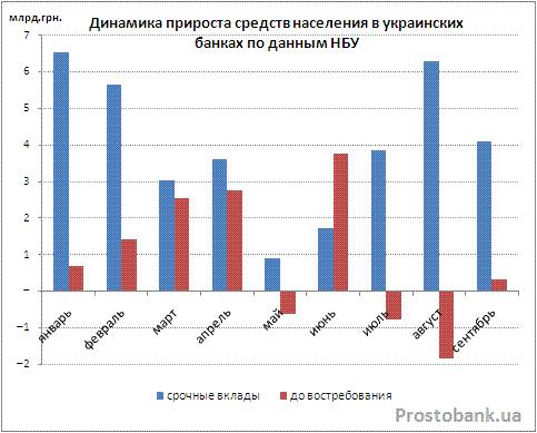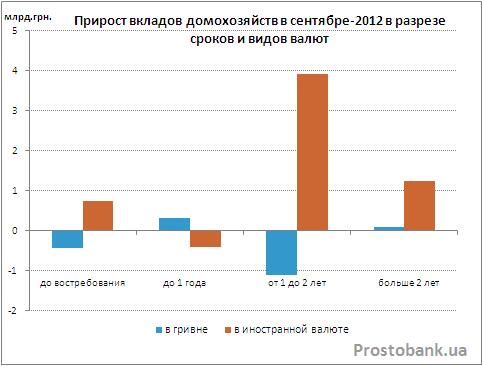 А непосредственной темой нашего обзора стал прирост вкладов физлиц в украинских банках за сентябрь 2012 года. По данным НБУ сентябрь-2012, также как и предыдущий месяц, отметился приростом срочных вкладов украинцев в банковских учреждениях. Правда, по сравнению с августом-2012 прирост этот был на два миллиарда гривен меньше. Однако объем средств на счетах до востребования в сентябре-2012 вырос на 323 миллиона гривен, в отличие от предыдущего месяца, когда он сократился сразу на 1,8 миллиарда. Так что в итоге общий прирост средств украинских вкладчиков в банках в сентябре-2012 почти не отличался от августовского и составил 4,4 миллиарда гривен.