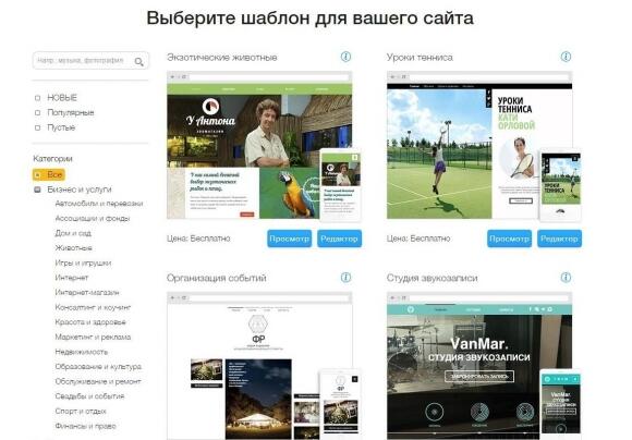 Кроме того, что этот сервис насчитывает 28 шаблонов, он еще и содержит бесплатный фотобанк и систему продвижения страницы в интернете с помощью контекстной рекламы в Yandex и Google. Цена услуги — 120 грн/мес. с возможностью подключения своего домена.