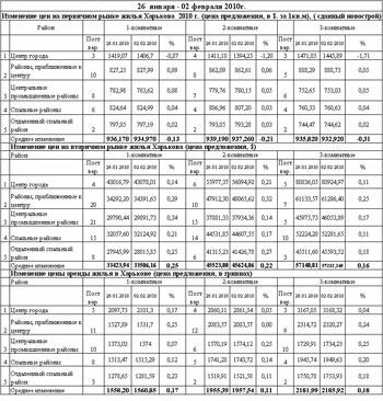В то же время по данным компании "SV Development" за период с 1 января по 1 февраля 2010 года средняя цена продажи 1-3 комнатных квартир на вторичном рынке в Харькове выросла на 0,06% ($1) до $945 за кв. м. При этом самым дешевым оставался Орджоникидзевский район, со средним показателем $808/кв. м, самым дорогим Киевский район, где средняя цена продажи составила $1 156/кв. м.