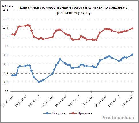 Продолжает сокращать ся разница между среднерыночной ценой продажи и покупки золота в слитках банками, по исследованиям компании «Простобанк Консалтинг» на 13.08.2012 г. она составляет уже всего 4,4%.