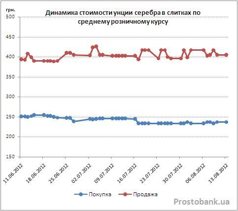 Что касается серебра, то этому металлу в последние месяцы нечем порадовать инвесторов. Средняя стоимость, по которой банки продают населению унциевые слитки серебра, в прошедший месяц выросла, по исследованиям компании «Простобанк Консалтинг», на 2,8 гривны. При этом средняя стоимость обратного откупа слитков того же веса за тот же период снизилась на 7,8 гривны. В итоге, разница между ценой покупки и продажи серебряных слитков в середине августа-2012 составляет в среднем по рынку около 42%.