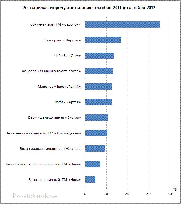 Цены на некоторые популярные товары в супермаркетах города Киева. По исследованиям компании «Простобанк Консалтинг» на 5 октября 2012 года. Жирным выделена самая дешевая цена на этот момент. Посещались магазины «Billa» на Троещине (просп. Маяковского, 85); «Велика Кишеня» на Ленинградской площади (просп. Мира, 2), «Сильпо» на Нивках (ул.Щербакова, 56),«Фуршет» на Нивках (просп. Победы, 94/1)