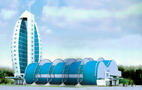 Как рассказал автор проекта архитектор Валентин Штолько, изначально планировалось построить только один спорткомплекс, но в процессе работы вырисовалась целесообразность размещения рядом с ним и гостиницы. И именно отель стал изюминкой проекта. Он напоминает кукурузный початок. Правда, выполнен в бело-голубых тонах. Интересен и сам спорткомплекс. Он должен включать в себя, в частности, полнометражное крытое поле (20х40 м), аналогов которому на сегодняшний день нет.