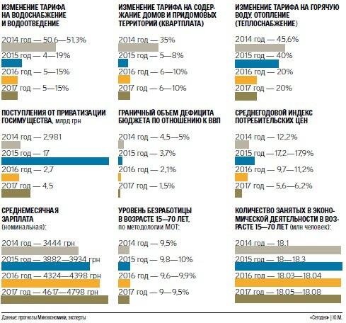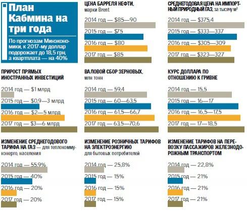Правительство сделало прогноз жизни украинцев на ближайшие три года. Инфляция в 2015-м может составить 18%, средняя зарплата вырасти до 3934 грн (сейчас 3444 грн), минзаплата – до 1378 грн (вместо нынешних 1218 грн), а курс доллара ожидается на уровне 16,5 грн. Такие цифры в прогноз развития Украины до 2017 года заложил Минэкономразвития, согласовав с МВФ. Документ оказался в распоряжении "Сегодня" (см. инфографику). Прогноз МЭРТа, по словам экспертов, очень "оптимистичный": курс доллара уже не вернется к отметке в 16 грн, а рост минимальной и средней зарплат съест инфляция.
