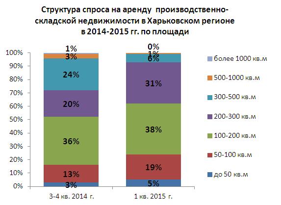 В январе-феврале 2015 г. доля производственно-складских помещений площадью более 300 кв.м в структуре спроса сократилась до 7%. Потенциальные арендаторы отдают предпочтение неотапливаемым помещениям и, в основном, готовы платить за аренду не более 10 грн./кв.м.