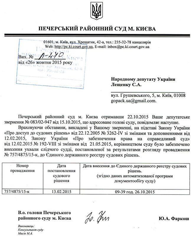 Попри те, що ухвала була прийнята понад півроку тому, в Єдиному реєстрі судових рішень її текст був оприлюднений тільки наприкінці жовтня – після депутатського звернення Сергія Лещенка.