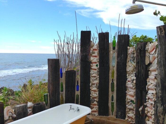 Jake’s on Treasure Beach на Ямайке – забавный курорт, который максимально использует преимущества тропической зоны, в том числе и душ в нём выглядит неожиданно. И пусть океана у нас нет, но идею по оформлению можно и позаимствовать.