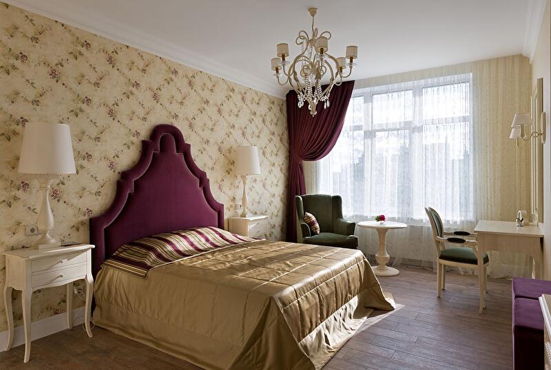 и сочным ярко-сливовыми акцентами в текстиле и отделке мебели.