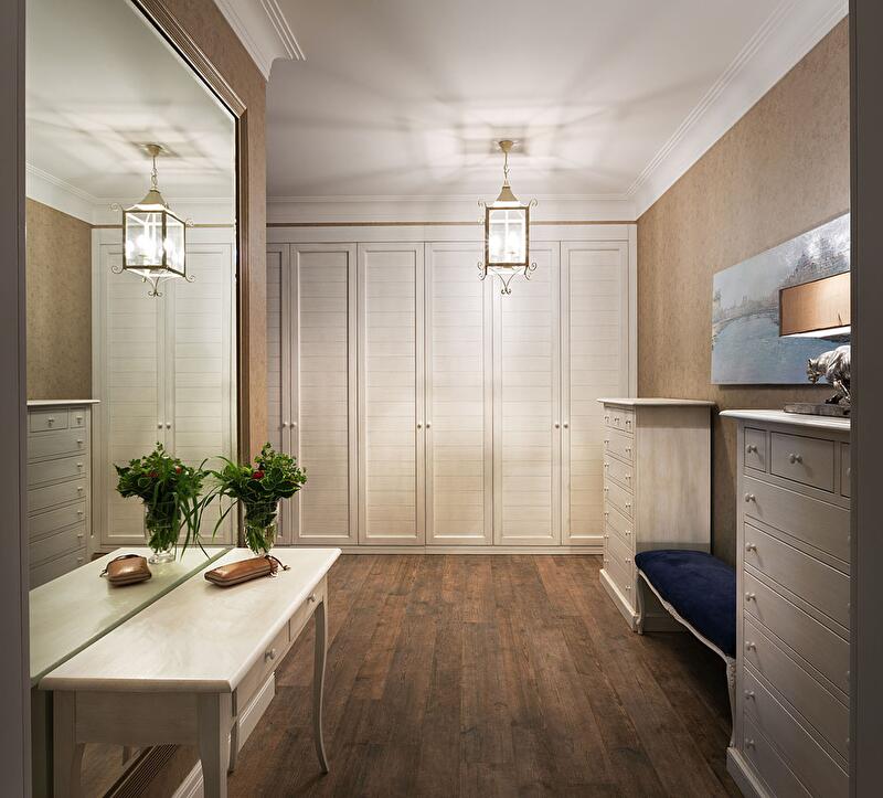 Для удобного расположения вещей системы хранения были разделены на несколько функциональных зон. В спальне все шкафы и их наполнение выполнены под заказ в соответствии с привычками и особенностями гардероба хозяев.