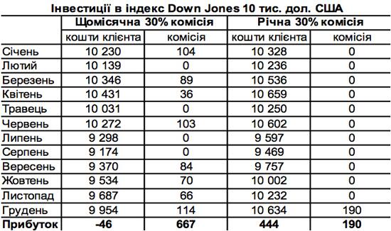 Це лише за умови, що клієнт не буде робити жодних інших операцій - лише вкладатиме гроші в інструменти, що базуються на індексі Доу Джонса. Хоча напевно і в цьому разі з нього "знімуть" ще й комісію за послуги банку.
