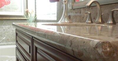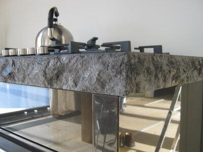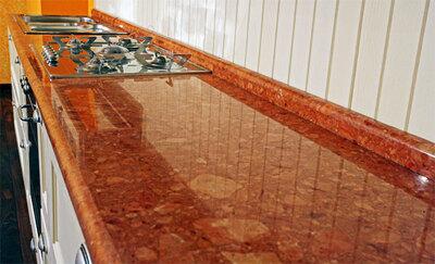 Искусственный камень представляет собой композит из минерального наполнителя, пигментов и связующего компонента - акриловой смолы. Иногда такой композит называют акрилатом. Заготовку из камня наклеивают на цельную древесно-стружечную плиту либо на специальный каркас, а затем прикрепляют декоративный бордюр, пристеночный бортик. Рабочая поверхность может принимать любую необходимую геометрическую форму.