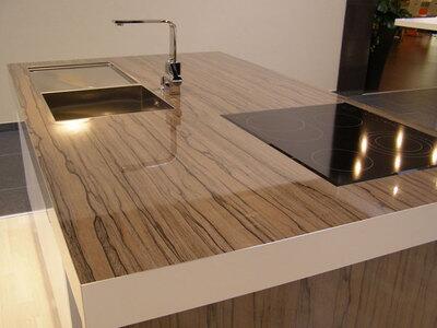 Один из самых дорогих вариантов отделки рабочей поверхности. В качестве материала используются мрамор, гранит, кварц и оникс. Столешницы из натурального камня лучше всего размещать в сухих и чистых помещениях, там, где они не будут подвергаться активному использованию.