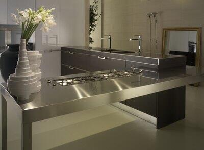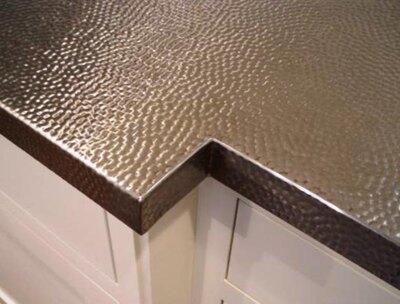 Влагостойкая древесно-стружечная плита облицовывается листами нержавейки. Чем толще лист, тем дороже плита. Поверхность нержавейки может быть матовой, глянцевой или рефренной. Профессиональные повара всего мира предпочитают именно этот материал: он прочен и абсолютно гигиеничен.
