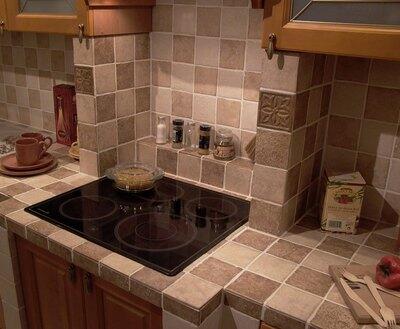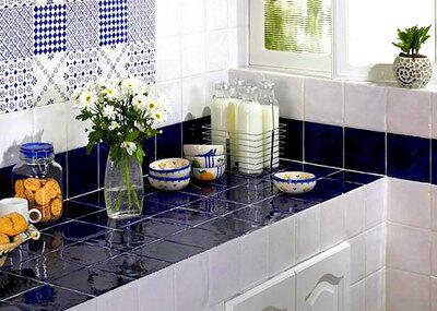 По физическим показателям поверхность не уступает другим материалам. Керамическую мелкоформатную плитку, керамогранит или мозаику укладывают на водостойкую основу (ДСП, МДФ, фанера либо влагостойкий гипсокартон), которая должна быть достаточно прочной, для крепежа используется металлический профиль. Для затирки швов необходим состав повышенной прочности.