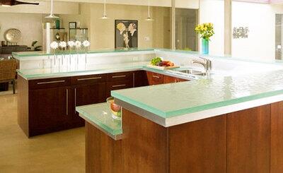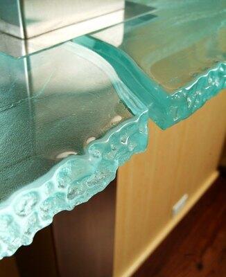 В качестве основы для столешницы используют безосколочное закаленное стекло (10-60 мм в толщину): матовое, тонированное, зеркальное, прозрачное или цветное. Возможны варианты с фотопечатью и подсветкой, дизайнерские фрагменты в виде ледяных плит.