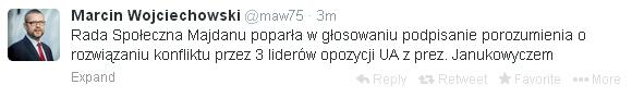 «Рада Майдану голосуванням схвалила підписання угоди про вирішення конфлікту трьома лідерами опозиції та президентом Януковичем». – написав Войцеховський
