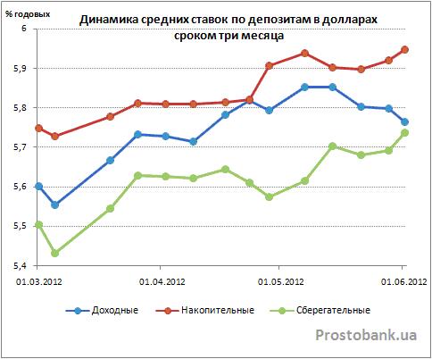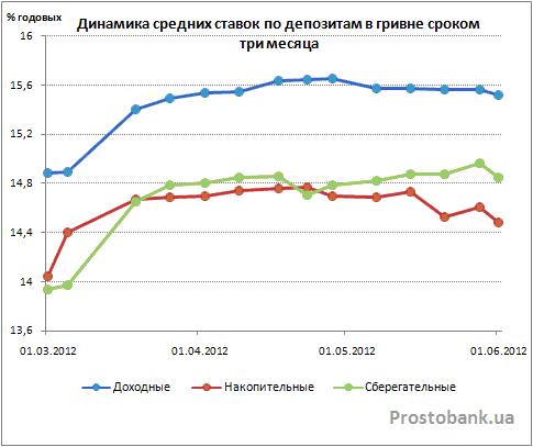 Среди гривневых депозитов наиболее заметным изменением средних ставок отличились накопительные вклады: их средняя доходность уменьшилась, по исследованиям компании «Простобанк Консалтинг», на 0,22 процентного пункта при сроке три месяца и на 0,1 процентного пункта по вкладам на год, что соответственно составило 1,5% и 0,6% от ее размера месячной давности.