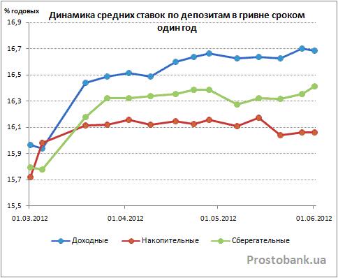 Интересно, что вопреки общему «затишью» и вопреки своему небольшому снижению в апреле-2012, максимальные ставки по депозитам в мае-2012 увеличились. Так, если месяц назад вкладчик мог рассчитывать не более чем на 22% годовых по вкладу в гривне и на 10% годовых в долларах, то по исследованиям компании «Простобанк Консалтинг» на 1.06.2012 г. максимальная доходность депозитов в гривне достигает 23% годовых (VAB Банк), а в долларах – 11% годовых (банк «Киевская Русь»).
