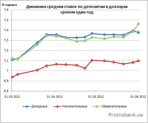 Среди вкладов в долларах наибольшее изменение средних ставок наблюдается по сберегательным вкладам. При сроке депозита три месяца, по исследованиям компании «Простобанк Консалтинг», средняя реальная ставка здесь выросла за месяц на 0,16 процентного пункта или почти на 3% от своего значения на начало апреля-2012. А по вкладам на год средняя доходность за месяц увеличилась на 0,13 процентного пункта или на 1,8% от своего прежнего значения.