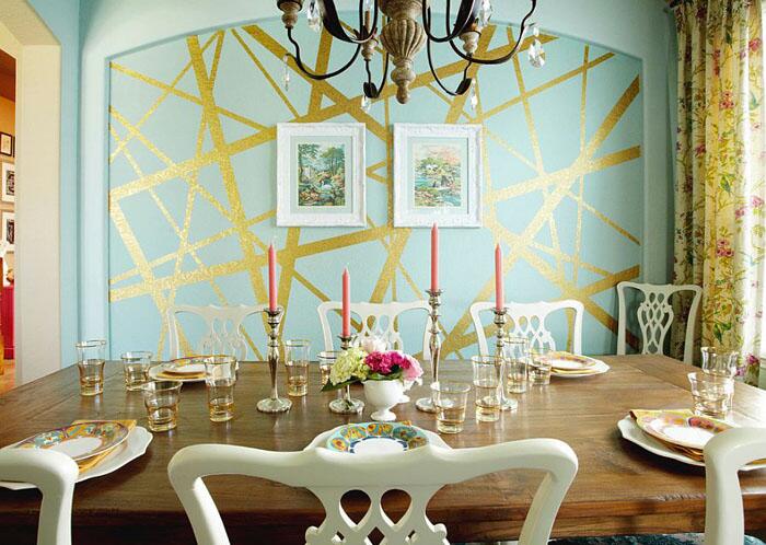 Если же желания кардинально менять представление о полосатой стене нет, тогда можно найти более элегантный вариант. Золотистые полосы тут же привлекают к себе внимание, а геометрический рисунок из них смотрится модно и эффектно.