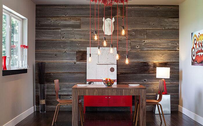 Полосатость можно создать различными способами, это совсем не означает, что придётся стену красить. Деревянные панели отлично подойдут тем, кто хочет привнести тепло и уют в столовую, где доминирует камень, бетон или стекло. Горизонтальные или вертикальные деревянные панели создадут текстурный и визуальный контраст, оставив цветовую гамму комнаты нетронутой. Обои помогут добиться того же эффекта.