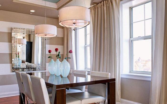 Можно подобрать ещё менее экстравагантные дизайны, которые всё равно благодаря цветовой палитре и простой симметрии будут смотреться восхитительно. Это самый простой способ украсить уголок для завтрака или выделить обеденную зону при открытой планировке.