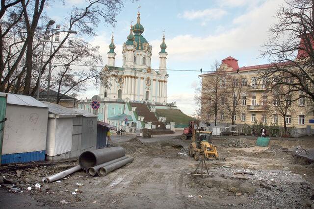 Уже в феврале киевляне смогут увидеть обновленный Андреевский. Здесь закончат реконструкцию инженерных сетей, ограничат въезд и запретят парковку в дневное время. Сейчас верхнюю часть Андреевского спуска "украшает" огромный котлован: разрыли участок рядом с Андреевской церковью и под носом у Прони Прокоповны и Голохвастова. Рабочие сняли брусчатку, перерыли дорогу, оставив свободными только тротуары, а часть участка обнесли зеленым забором.