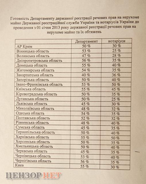 По данным, имеющимся в распоряжении «Цензор.НЕТ» , страна даже близко не готова к реформе. Департаменты государственной регистрации имущественных прав на недвижимое имущество на местах готовы в среднем на 40-55%. А вот нотариаты, на которые, в сущности, и будет возложена миссия регистрировать сделки с недвижимостью, готовы к реформе в среднем едва ли на 30 процентов.