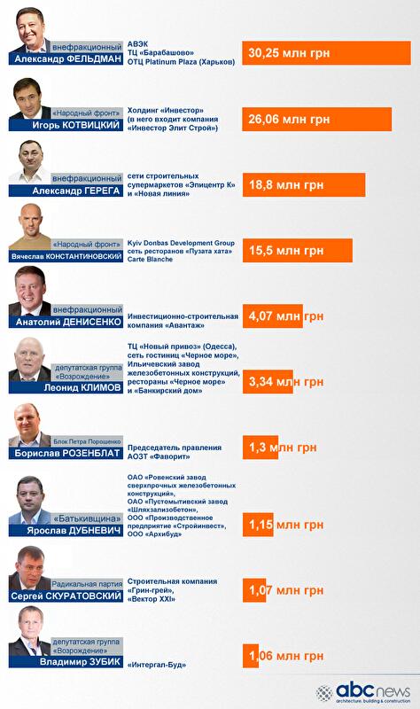В рейтинг, составленный ABCnews, вошли народные депутаты, сфера бизнес-интересов которых в первую очередь связана со строительством и недвижимостью. Редакция включила в него десять нардепов, которые в 2014 году согласно обнародованным декларациям получили доход, превышающий 1 млн грн. В этом списке как известные и значимые бизнесмены, так и народные избранники, о деятельности которых известно лишь по скупым высказываниям в открытых источниках.